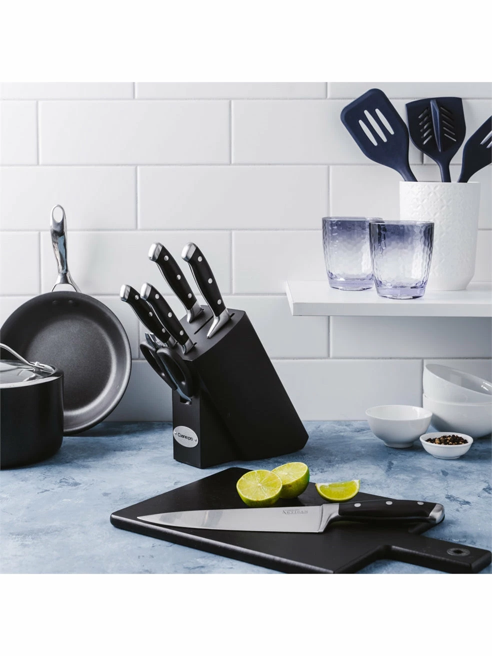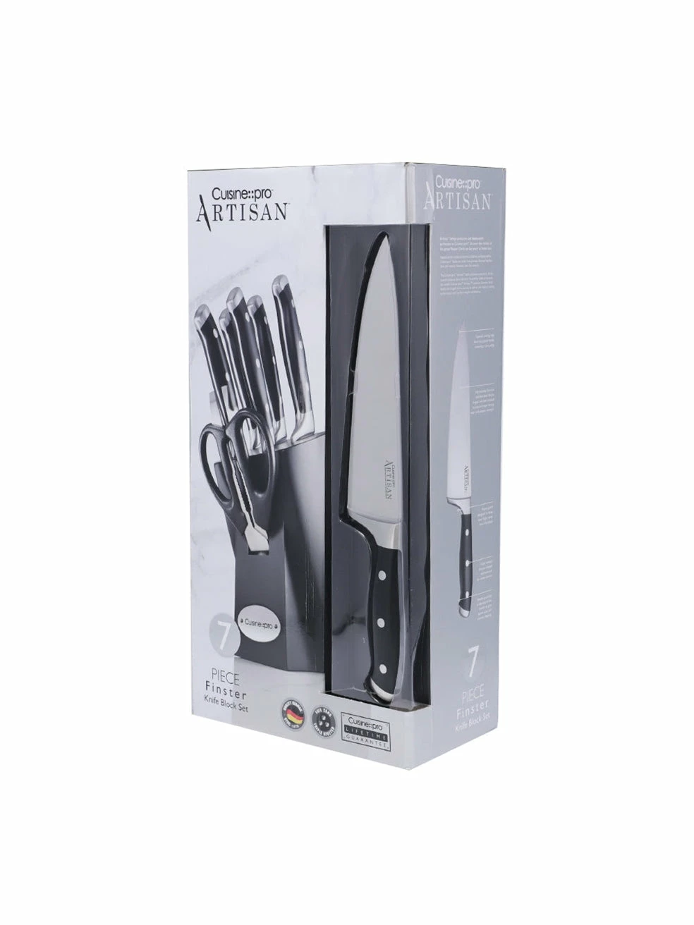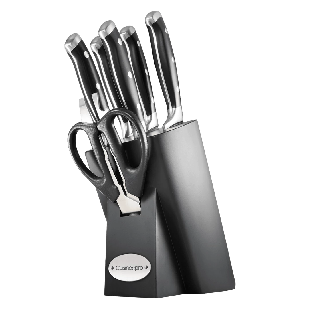 The Cuisine – – pro® Finster™ 7 Piece Knife Block contains – 1x All Purpose Kitchen Scissors, 1x 9cm/3.5″ Paring Knife, 1x 12.5cm/5″ Utility Knife, 1x 18cm/7″ Santoku Knife, 1x 20cm/8″ Carving Knife, 1x 20cm/8″ Chefs Knife. Housed in a stylish knife block to showcase your blades.