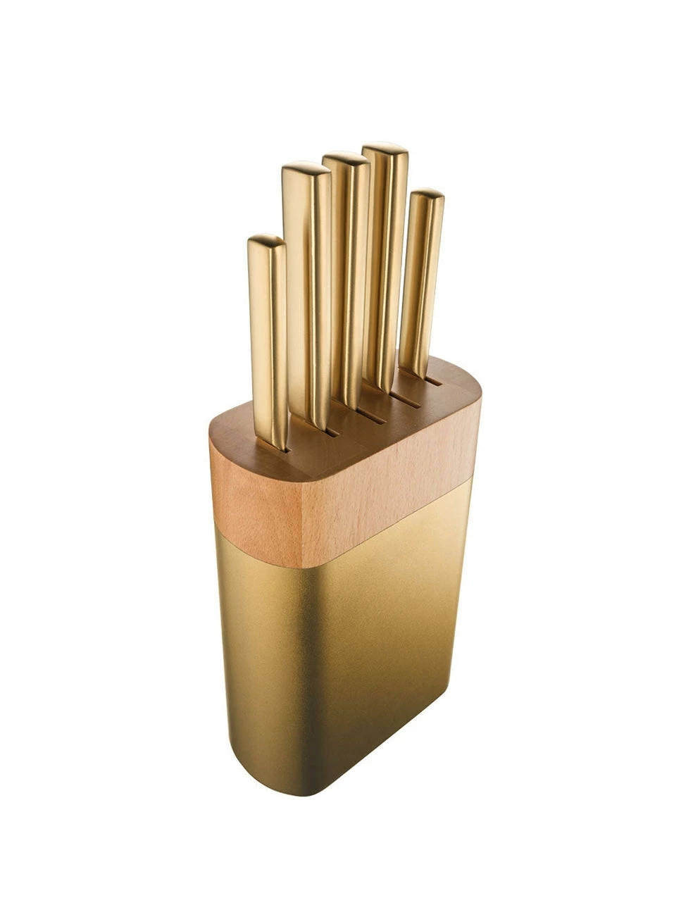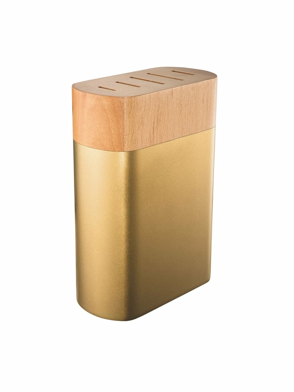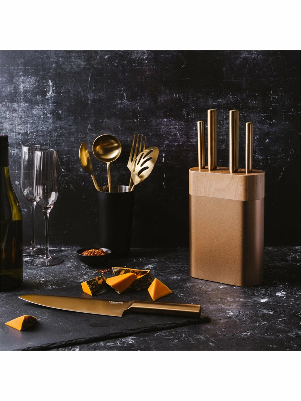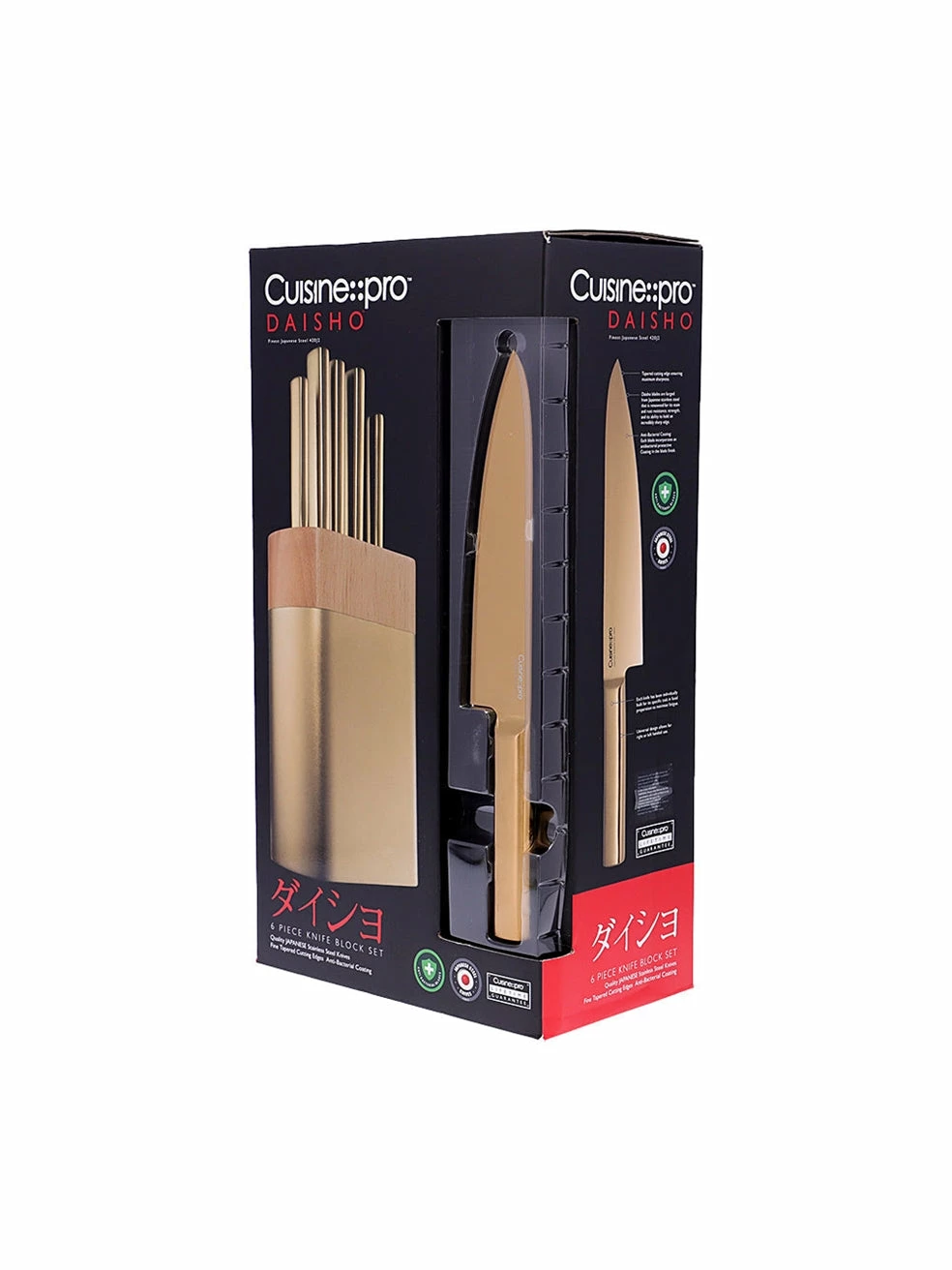 The Cuisine – – pro® DAISHO Nara 6 Piece Knife Block Brass contains – 1x 9cm/3.5″ Paring Knife, 1x 12cm/4.5″ Utility Knife, 1x 14cm/5.5″ Santoku Knife, 1x 20cm/8″ Bread Knife, 1x 20cm/8″ Chefs Knife. Housed in a stylish knife block to showcase your blades.