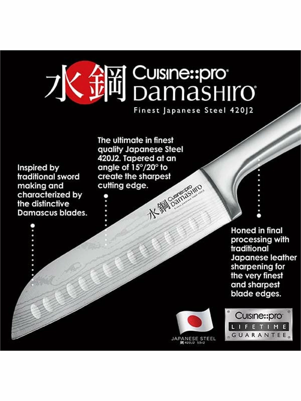 Cuisine – – pro® Damashiro® knives by THE CUSTOM CHEF™ have been crafted from the finest Japanese Steel 420J2 and ice-hardened ensuring superior blade strength and durability. The Damashiro® range features distinctive Damascus inspired blades inspired by traditional Japanese craftsman and Samurai sword makers. Characteristic of banding and mottling reminiscent of flowing water.