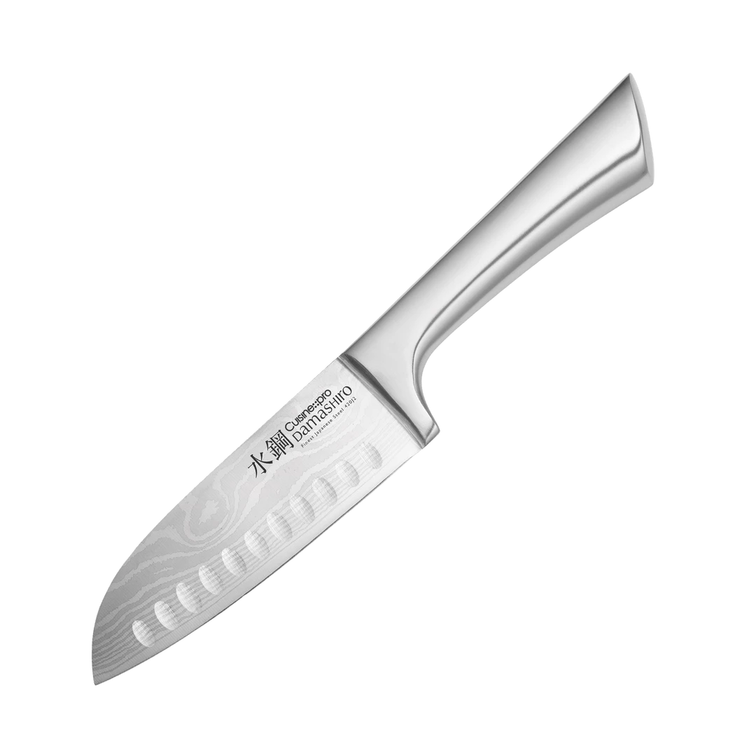 The Cuisine – – pro® Damashiro® Santoku is #1 in the kitchen for Cutting, Slicing, Chopping, Dicing, Mincing and so much more. It is the Perfect knife when cutting meats, slicing cheeses, and chooping or dicing vegatibles and nuts. The recessed scallops situated above the blade’s edge assists to release thin slices and sticky food after slicing.