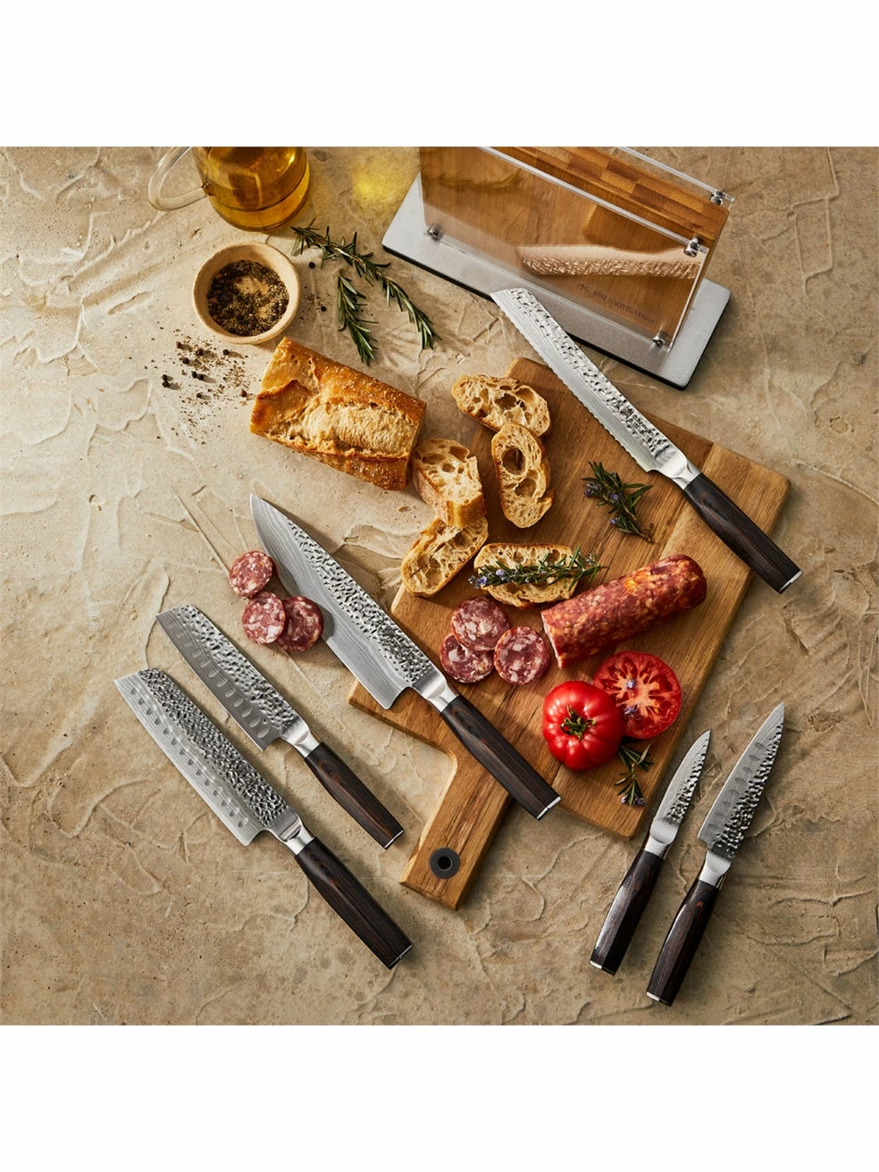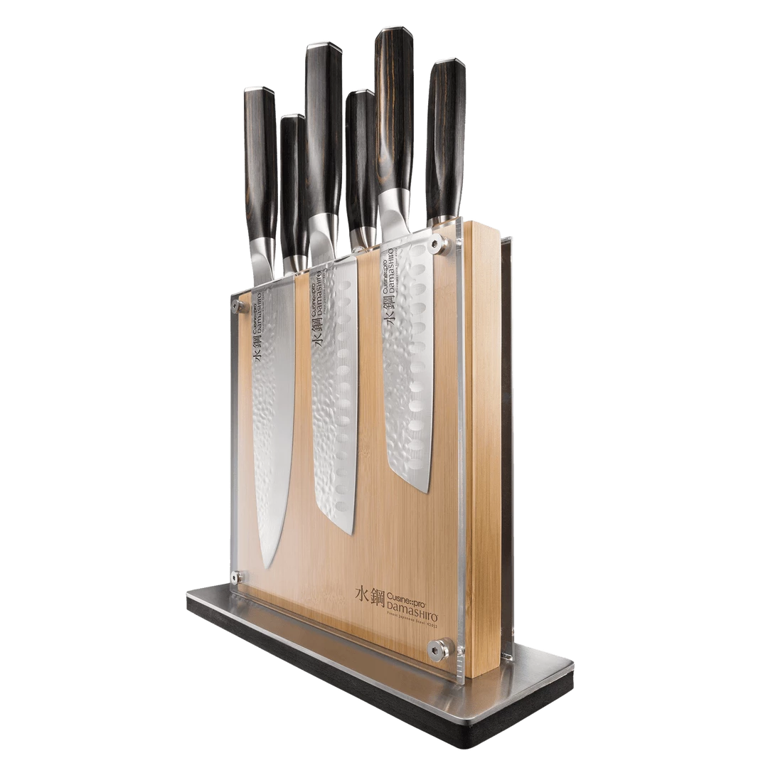 The Cuisine – – pro® Damashiro® EMPEROR Shi Knife Block 7 Piece contains – 1 x 20cm/8″ Chef Knife, 1 x 20cm/8″ Bread Knife, 1 x 17cm/6.5″ Santoku Knife, 1 x 14cm/5.5″ Santoku Knife, 1 x 12cm/4.5″ Utility Knife, 1 x 9cm/3.5″ Paring Knife. Housed in a stylish knife block to showcase your blades.