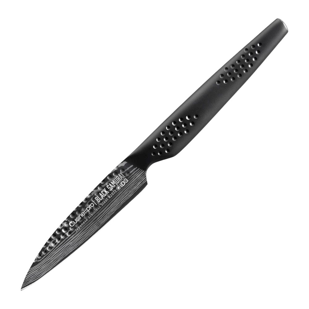 The Cuisine – – pro® iD3® BLACK SAMURAI™ Paring knife is our smallest kitchen knife. It has a razor sharp blade that is ideal for everyday culinary tasks of peeling and slicing fresh produce, or intricate work like deveining a shrimp, skinning mushrooms or cutting small garnishes.