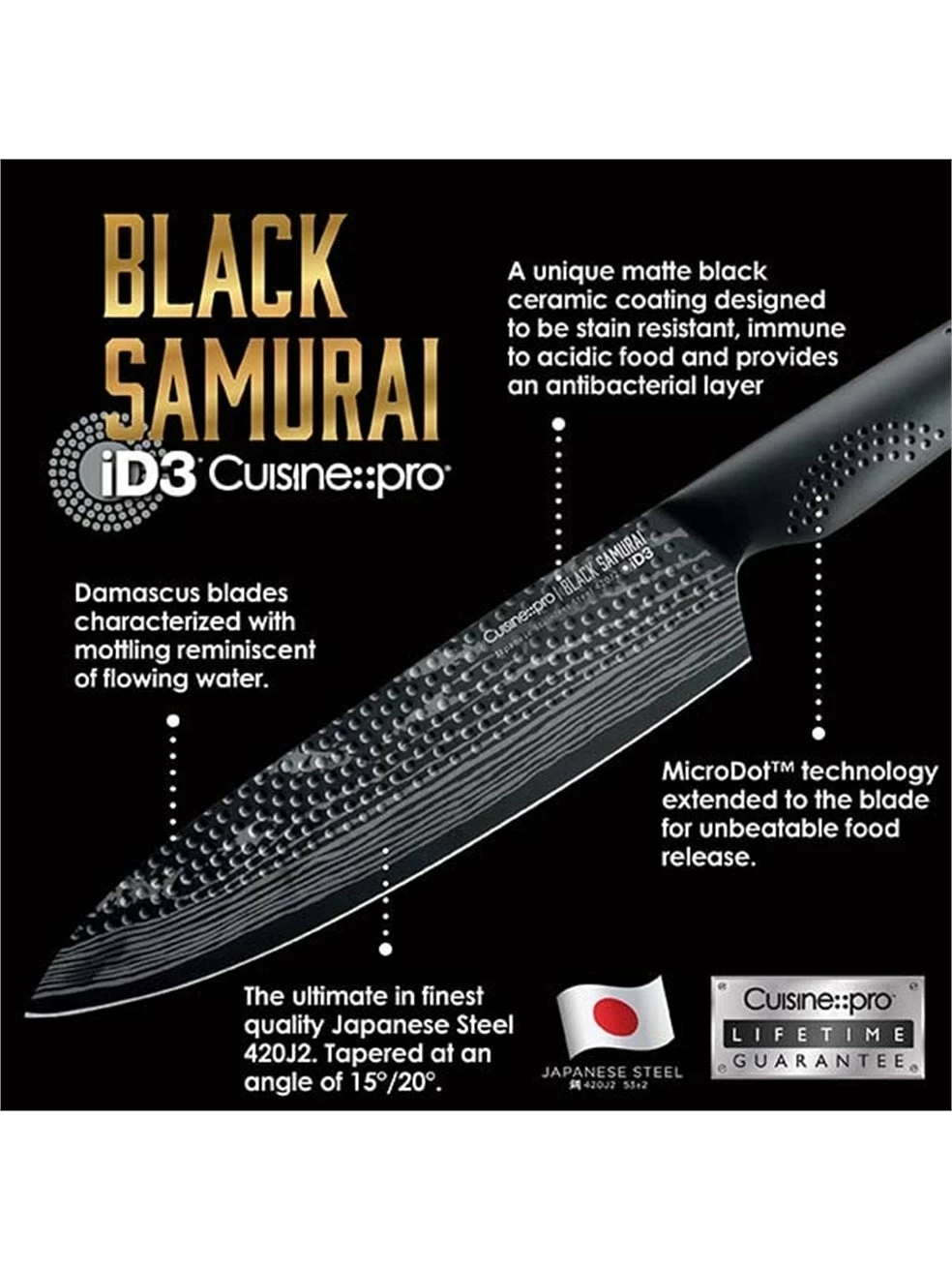 The Cuisine – – pro® iD3® BLACK SAMURAI™ is believed to be a World 1st. The combination of Japanese Steel 420J2 with a matte black Antibacterial-ceramic coating. The knife is designed to be food-grade antibacterial, immune to acidic foods and stain resistant too.
