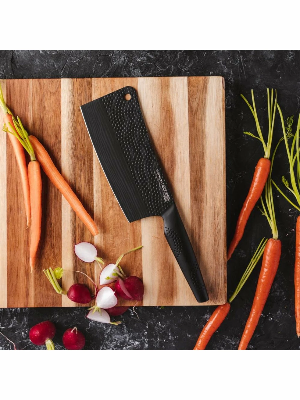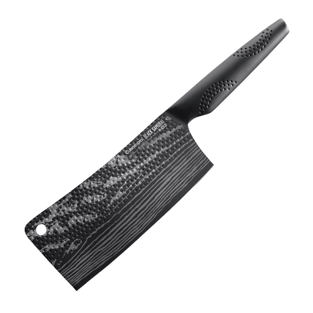 The Cuisine – – pro® iD3® BLACK SAMURAI™ Cleaver Knife blade will change the way you handle meats. In addition to being designed for portioning of poultry and varied cuts of meats, the Cleaver is perfect for cutting through heavier root vegetables with ease. It is engineered to be perfectly balanced and weighted, making chopping through bones a breeze.