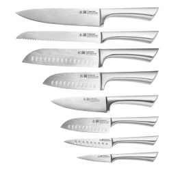 Cuisine – – pro® iD3® knives by THE CUSTOM CHEF™ are crafted from the finest Japanese Steel 420J2. The Japanese steel blade construction has been inspired by century old manufacturing techniques favored by traditional Japanese craftsman and Samurai sword makers, to create a super sharp cutting edge which holds a greater edge retention. The blades are ice-hardened ensuring superior blade strength and durability.