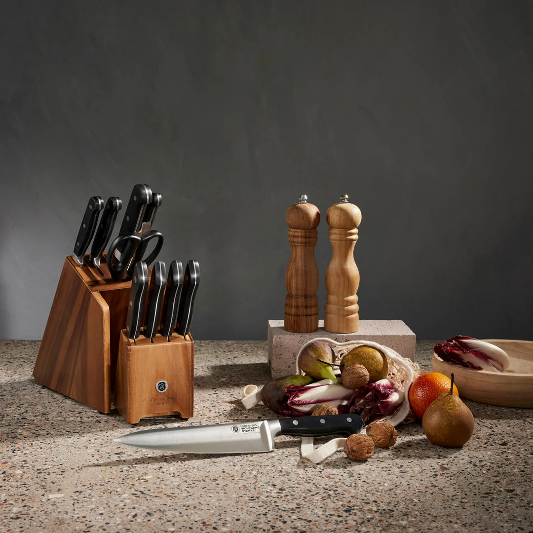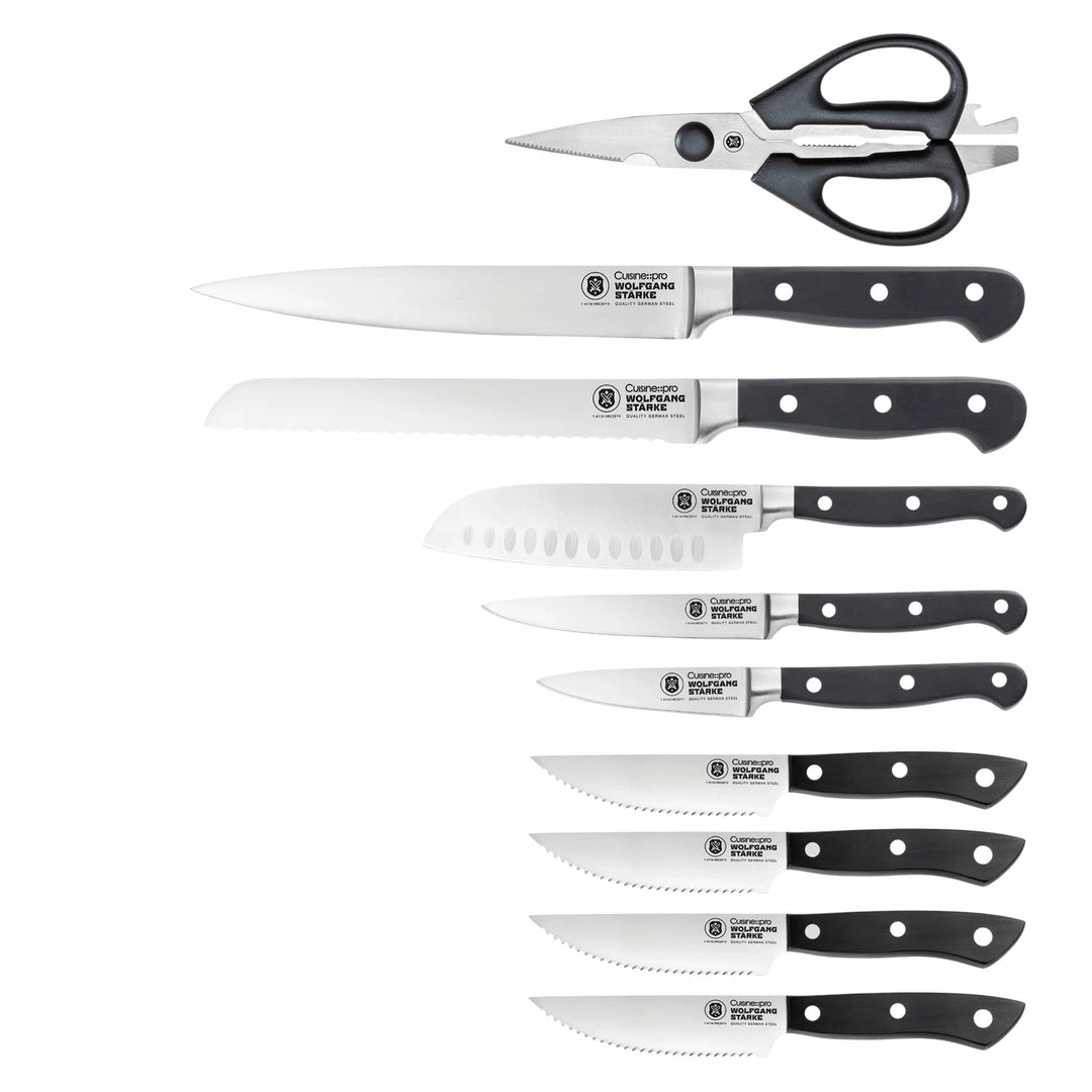 The Cuisine – – pro® WOLFGANG STARKE™ Kutchin 11 Piece German Steel Knife Block contains – 4 x Steak Knives, 1 x 9cm/3.5″ Paring Knife, 1 x 12cm/5″ Utility Knife, 1 x 14cm/5.5″ Santoku Knife, 1 x 20cm/8″ Bread Knife, 1 x 20cm/8″ Chef’s Knife, 1 x Kitchen Shears. Housed in a stylish knife block to showcase your blades.