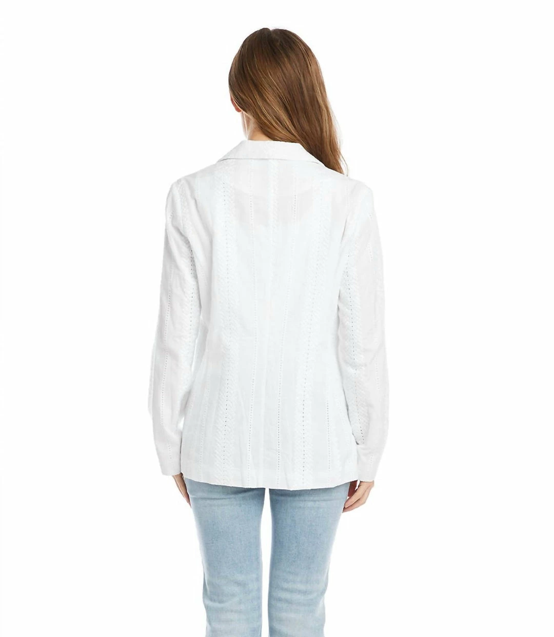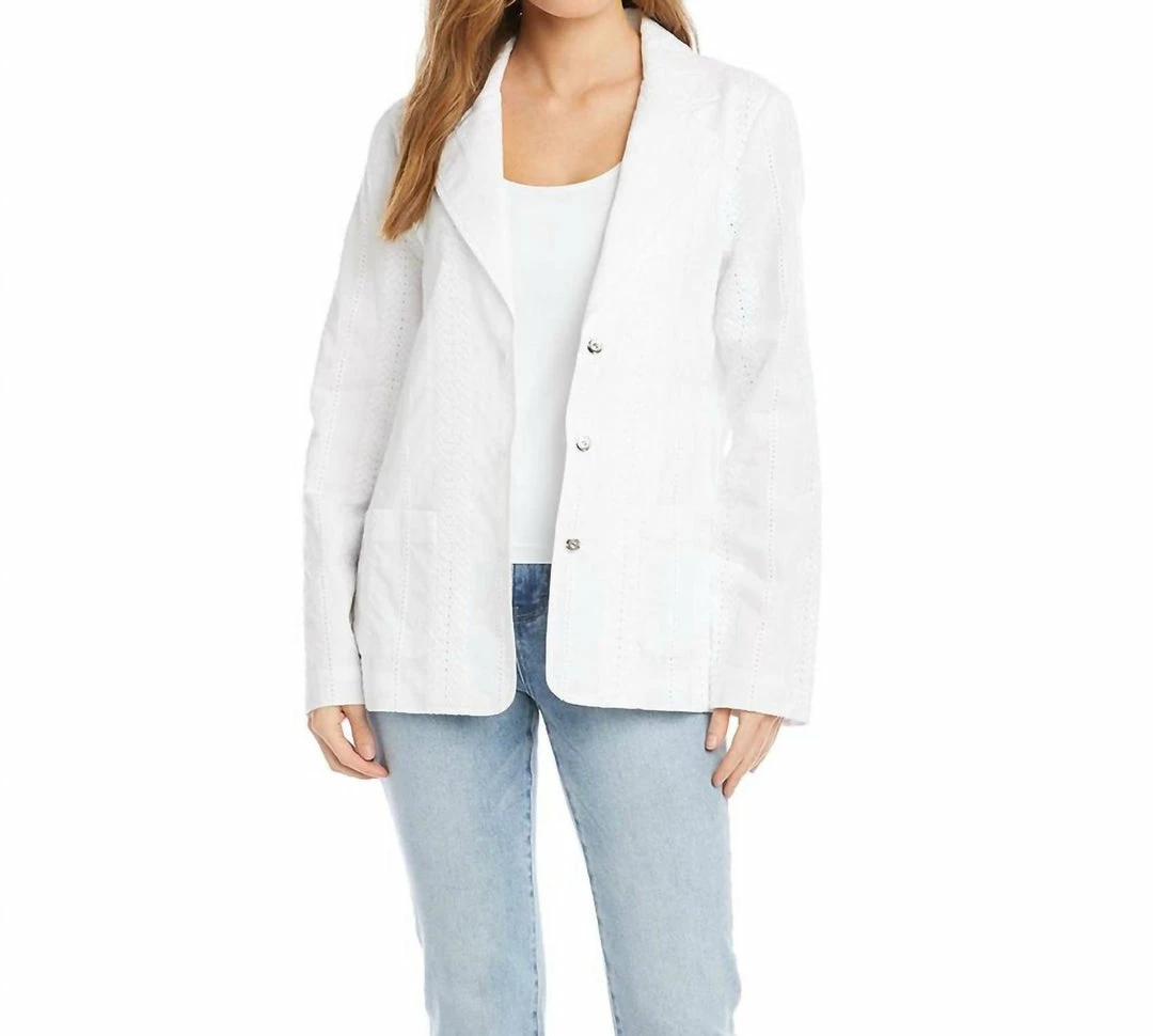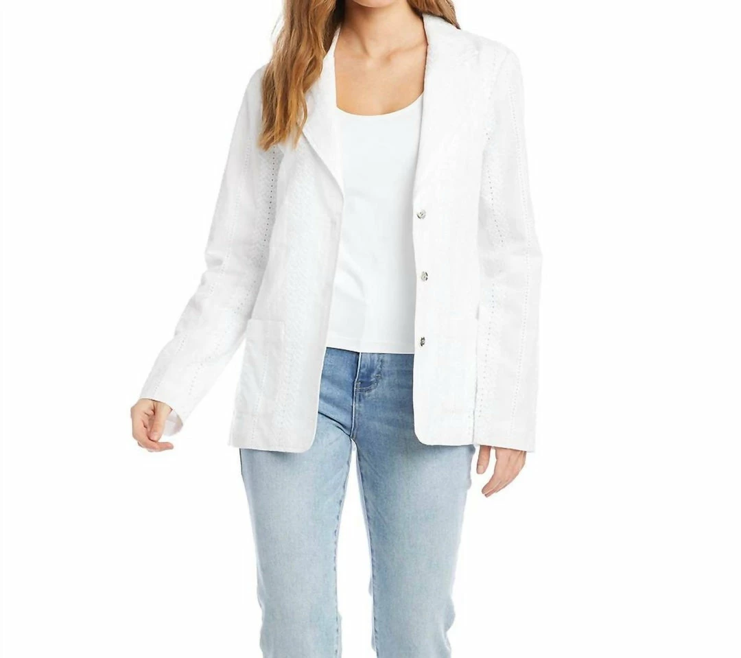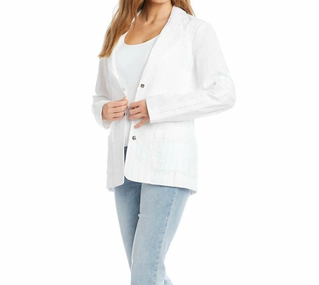 Embroidered eyelet lace embodies the essence of sunny days. This beautifully textured cotton blazer features a polished notched collar and handy pockets.DETAILSLinedLength – 27 3/4 inches (size M)100% CottonImportedDry clean onlyButton downPatch pocketsModel Height – 5 feet 9 inches Model is wearing a size small.Size ChartXS S M L XL Size 2 4 6 8 10 12 14 16 Bust 34 35 36 37 38 40 42 44 Waist 26Â 1/2 27Â 1/2 28Â 1/2 29Â 1/2 30Â 1/2 32Â 1/2 34Â 1/2 36Â 1/2 Hip 36Â 1/2 37Â 1/2 38Â 1/2 39Â 1/2 40Â 1/2 42 1/2 44Â 1/2 46 1/2
